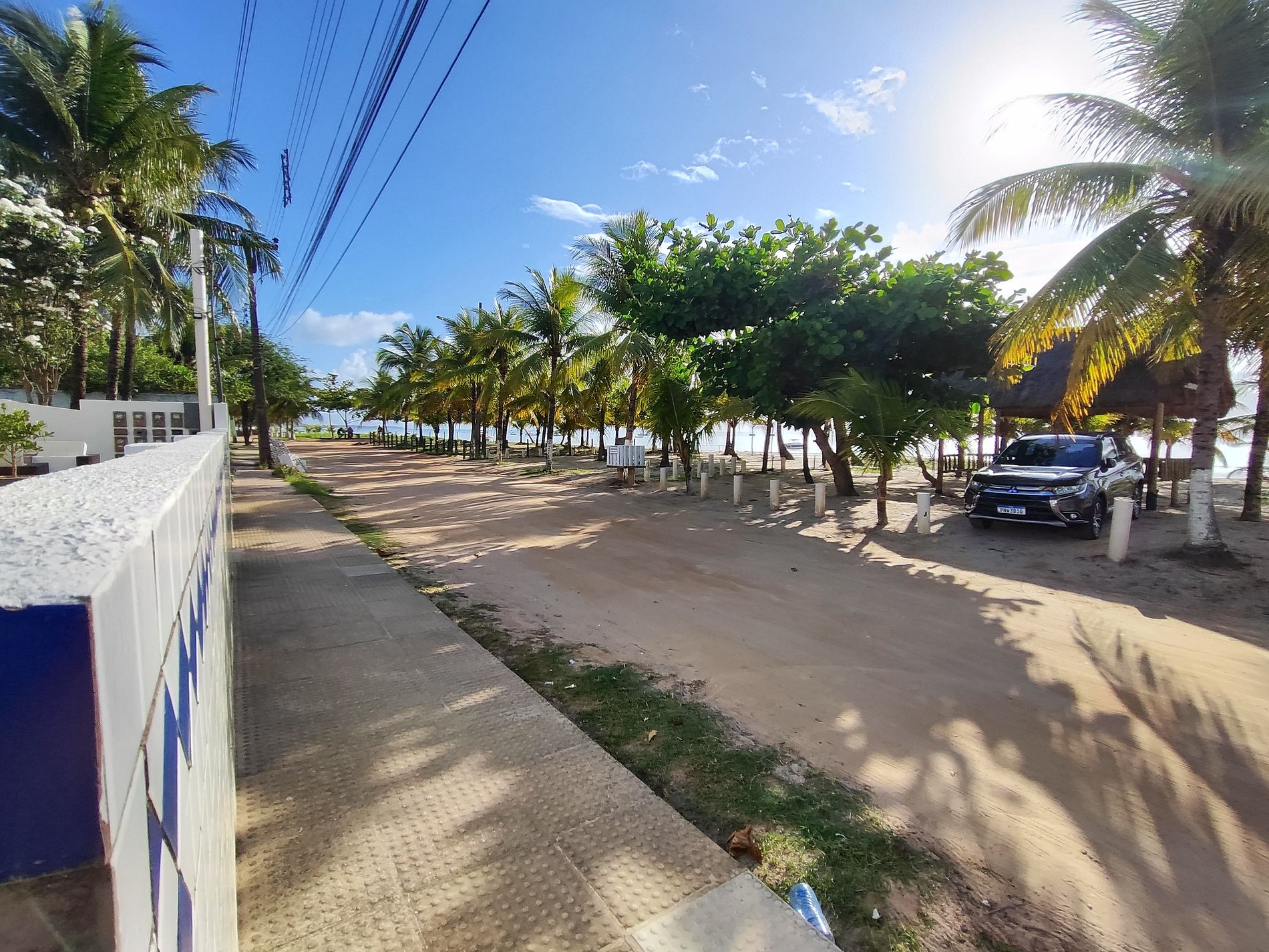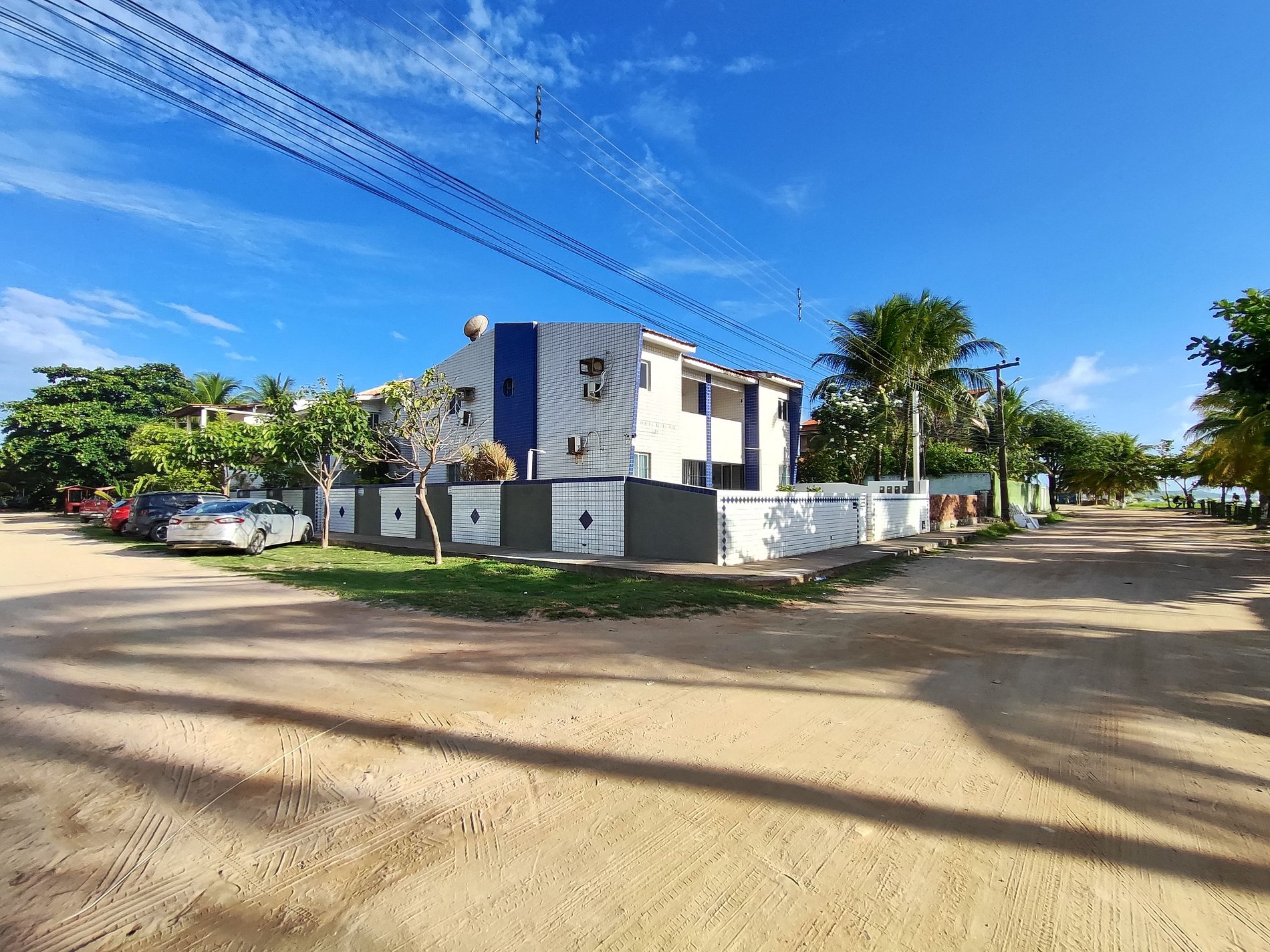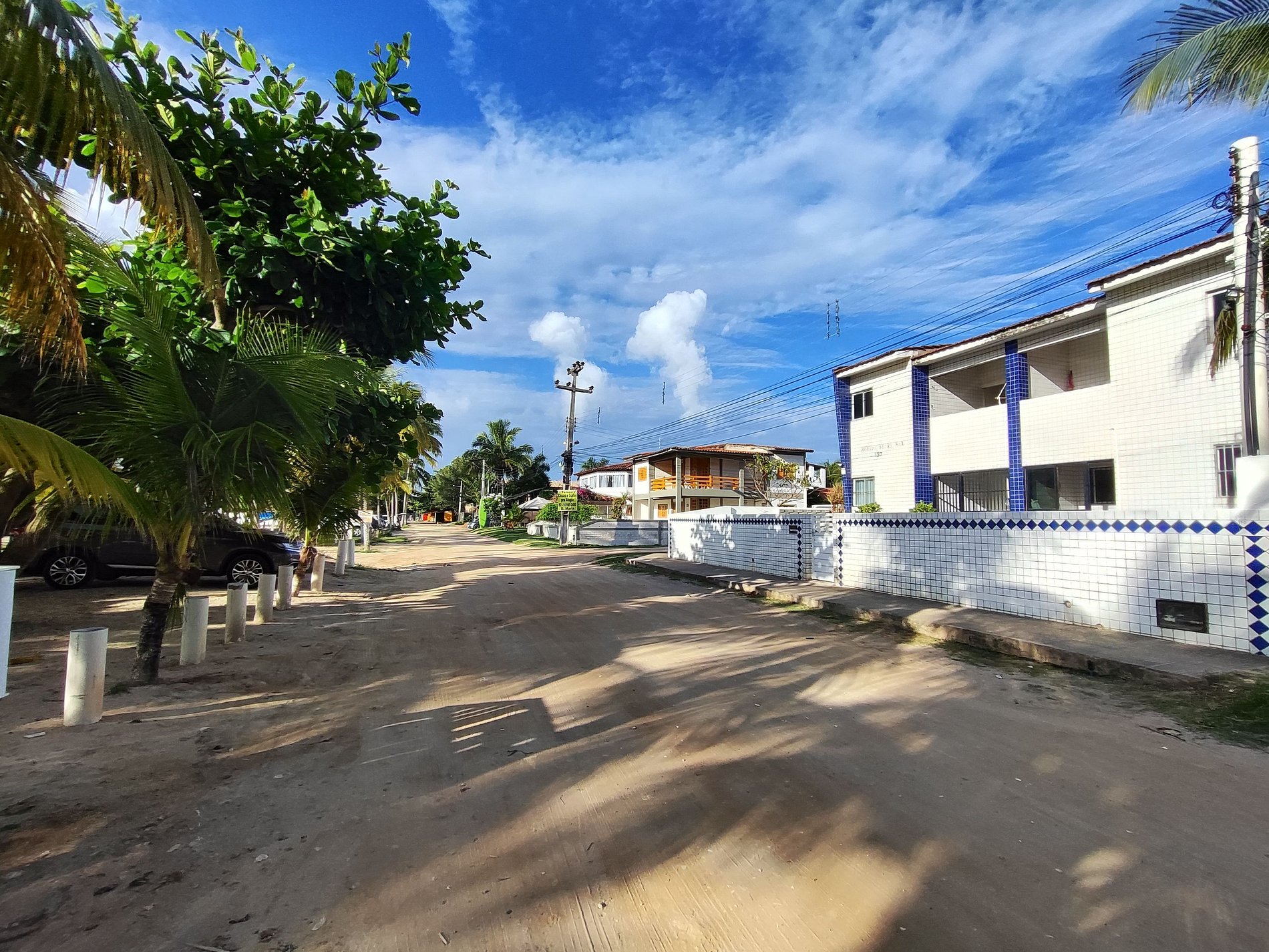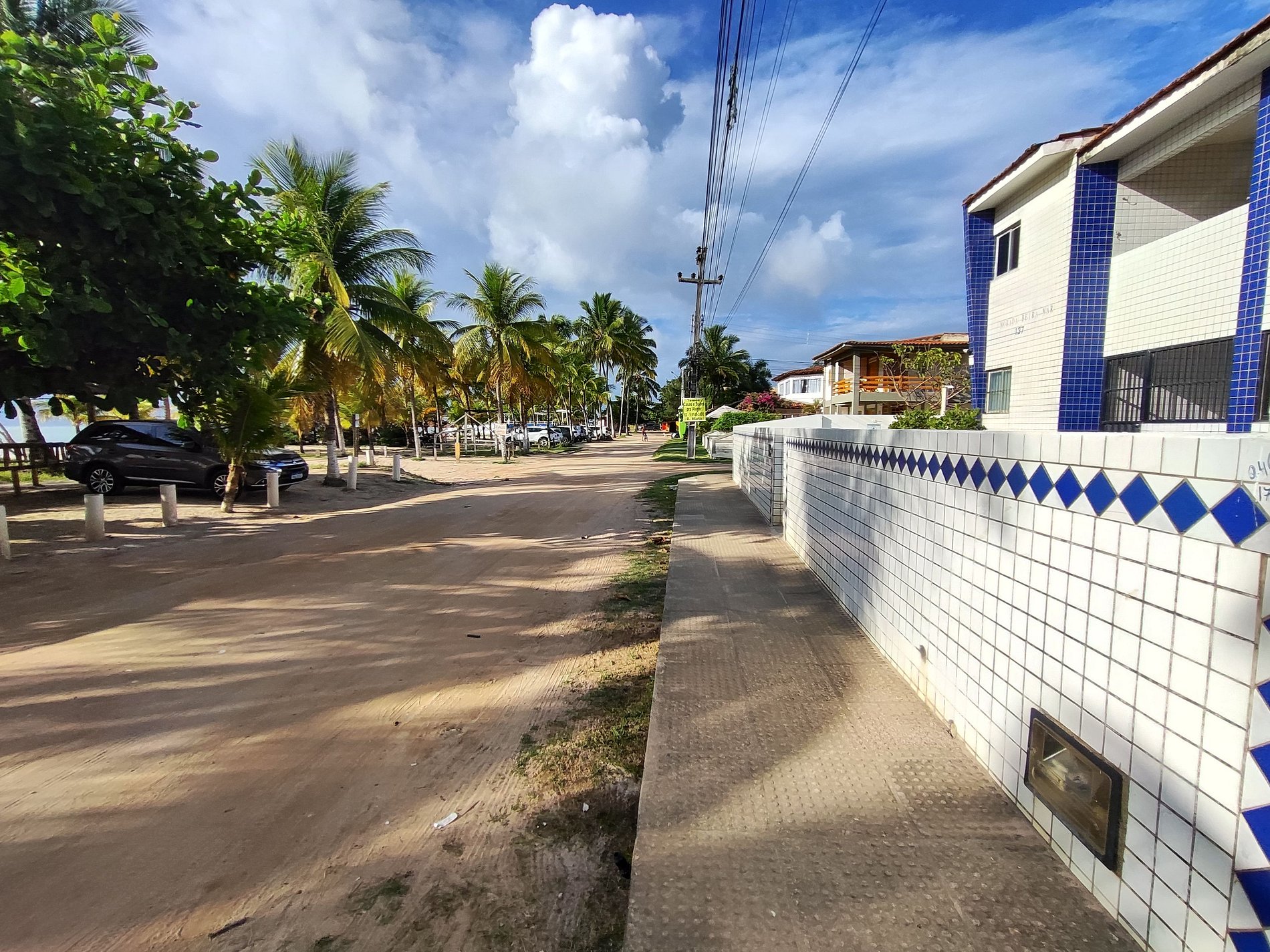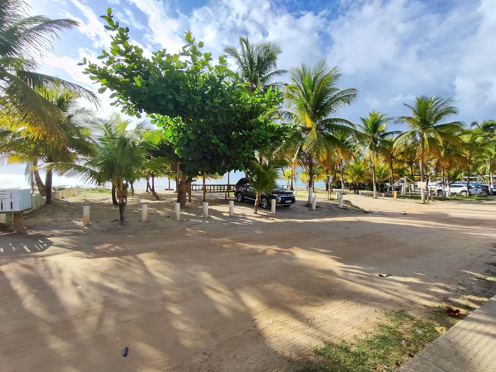 Na lateral do prédio as vagas de estacionamento estão demarcadas por placas, mas é permitido estacionar em qualquer espaço ao redor e nos coqueirais, desde que não atrapalhe a fluência do trânsito.