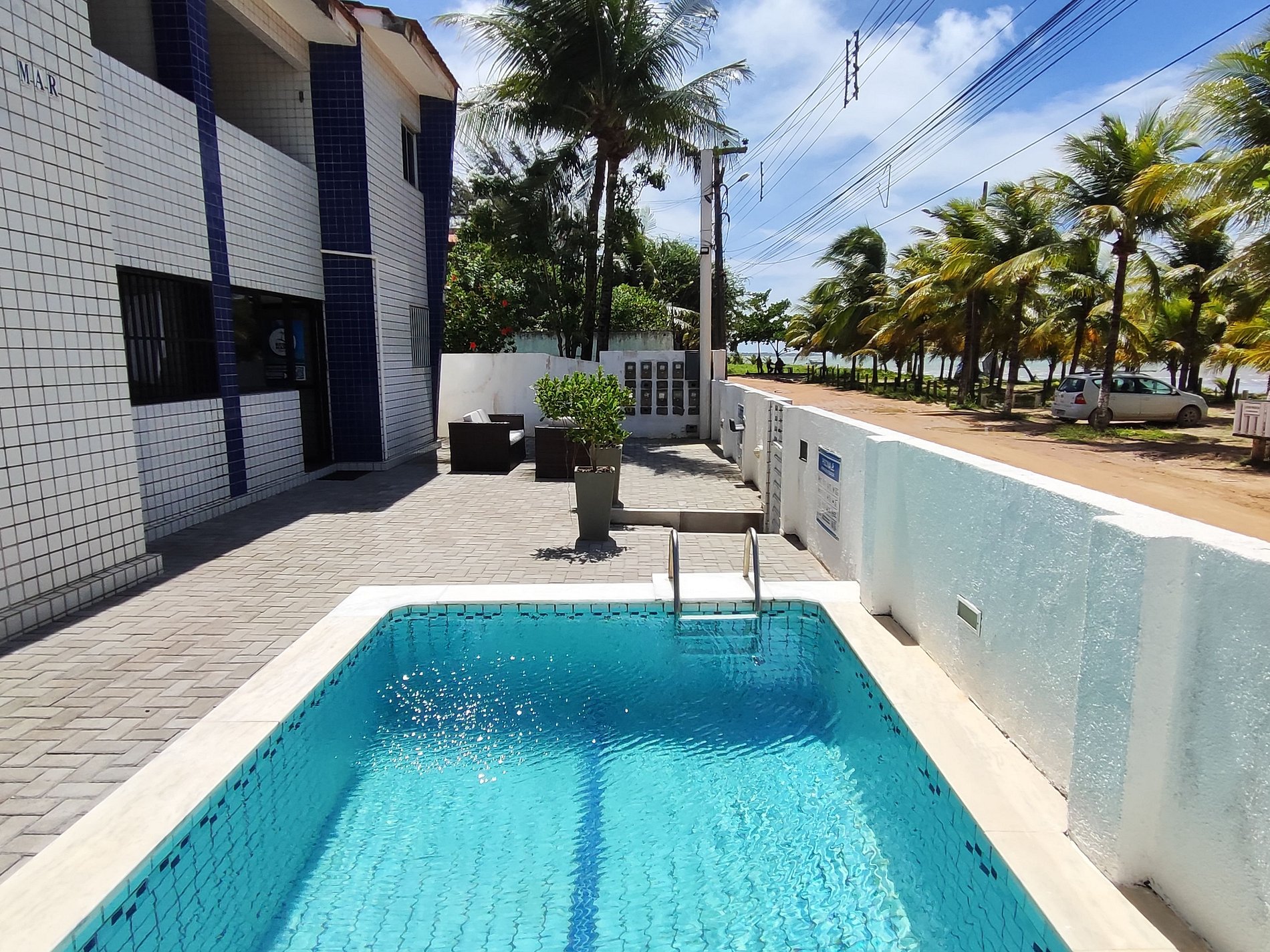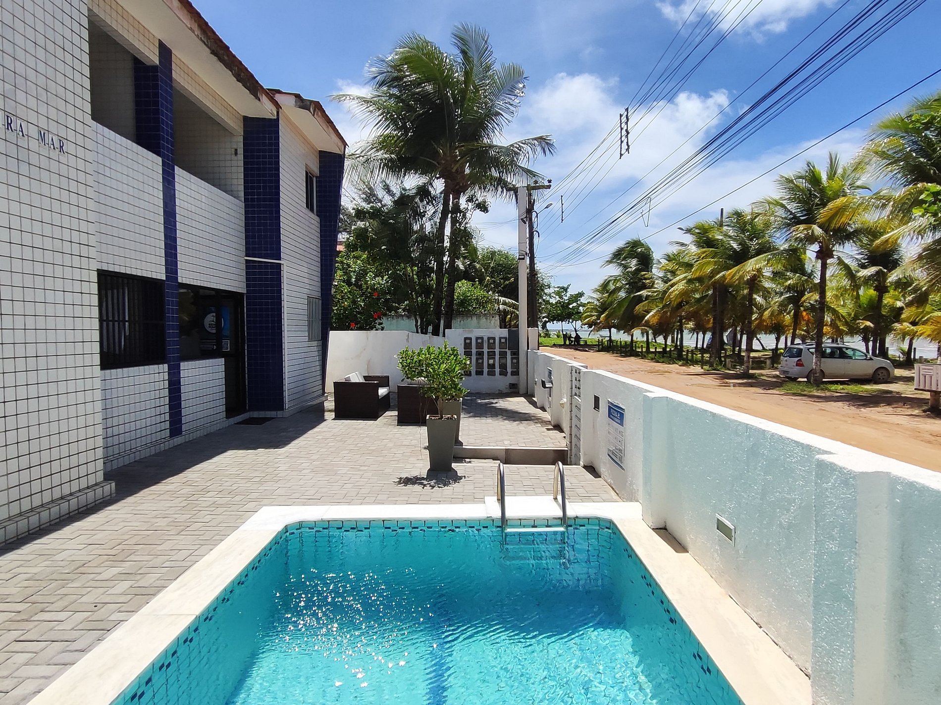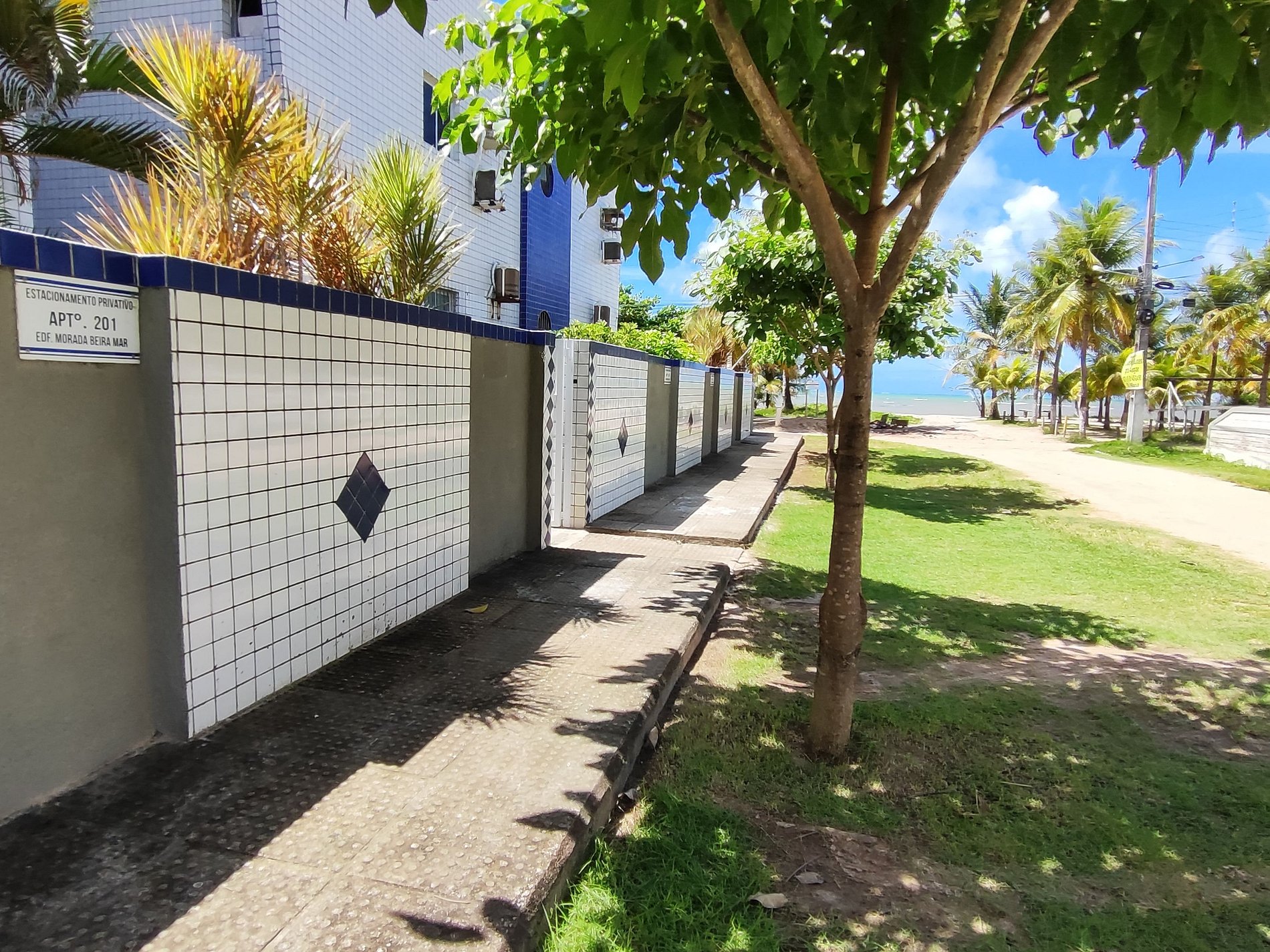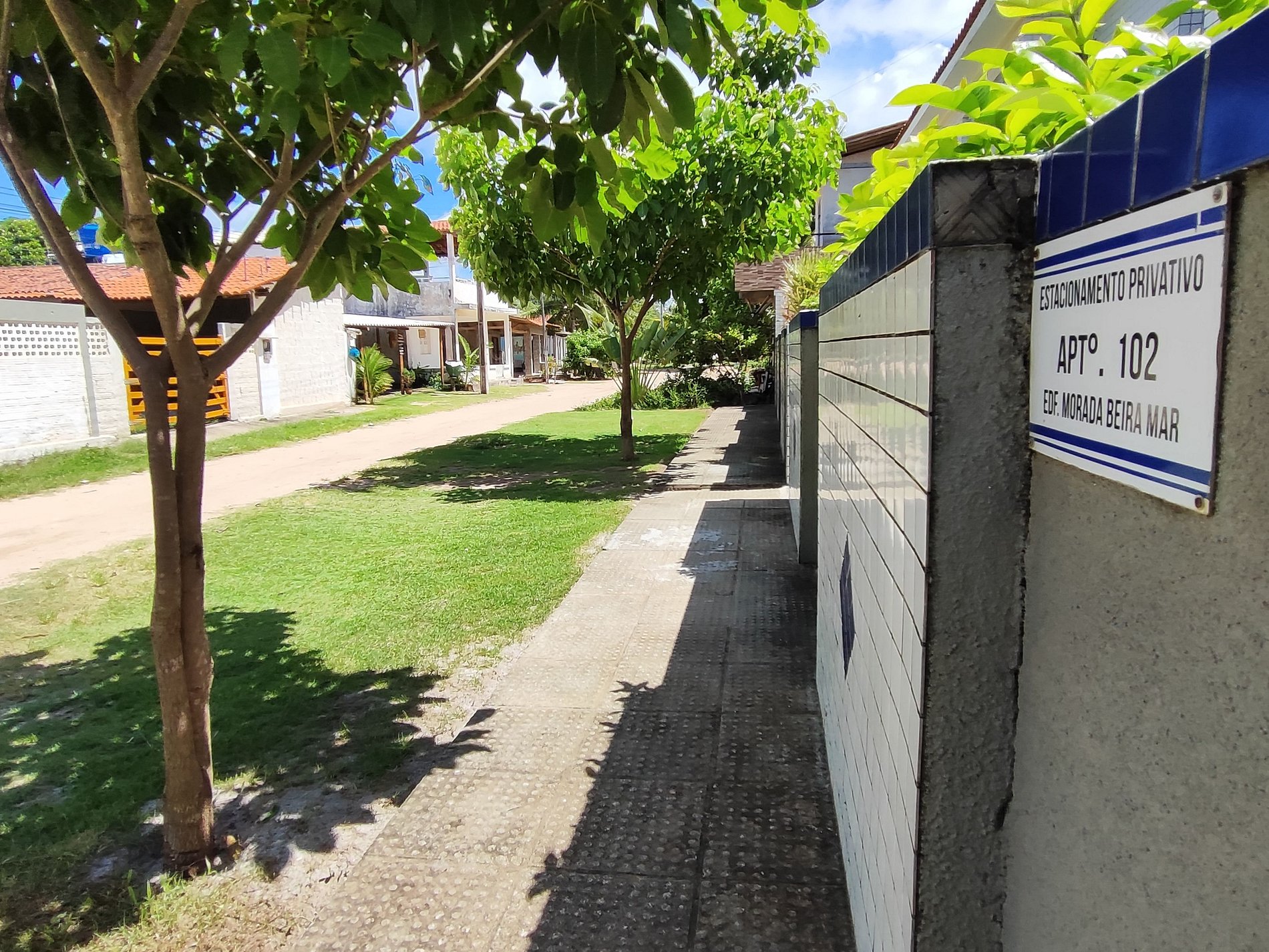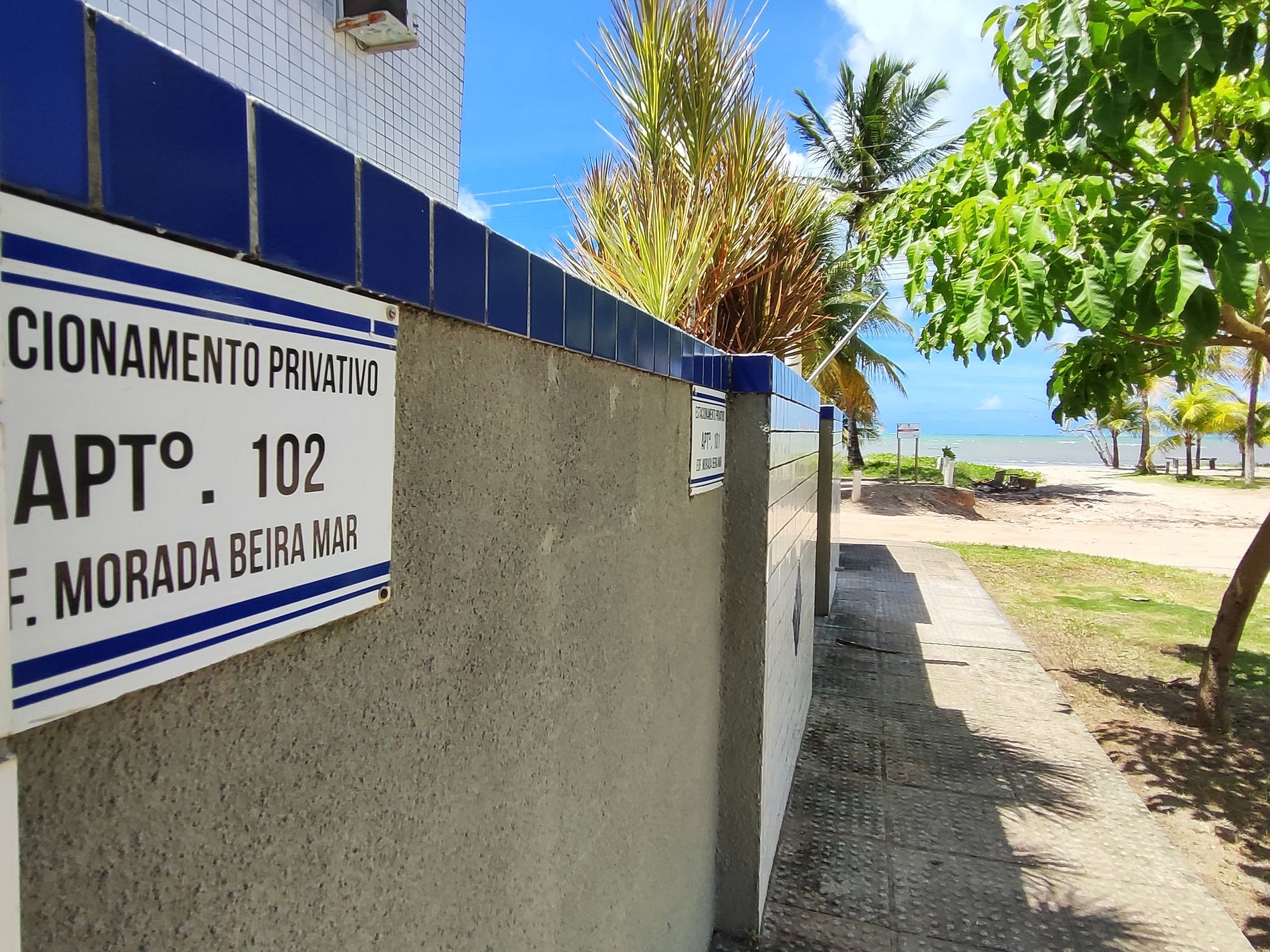 Na lateral do prédio as vagas de estacionamento estão demarcadas por placas, mas é permitido estacionar em qualquer espaço ao redor e nos coqueirais, desde que não atrapalhe a fluência do trânsito.