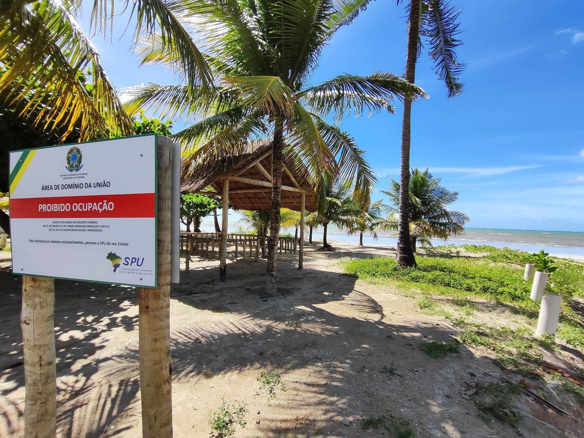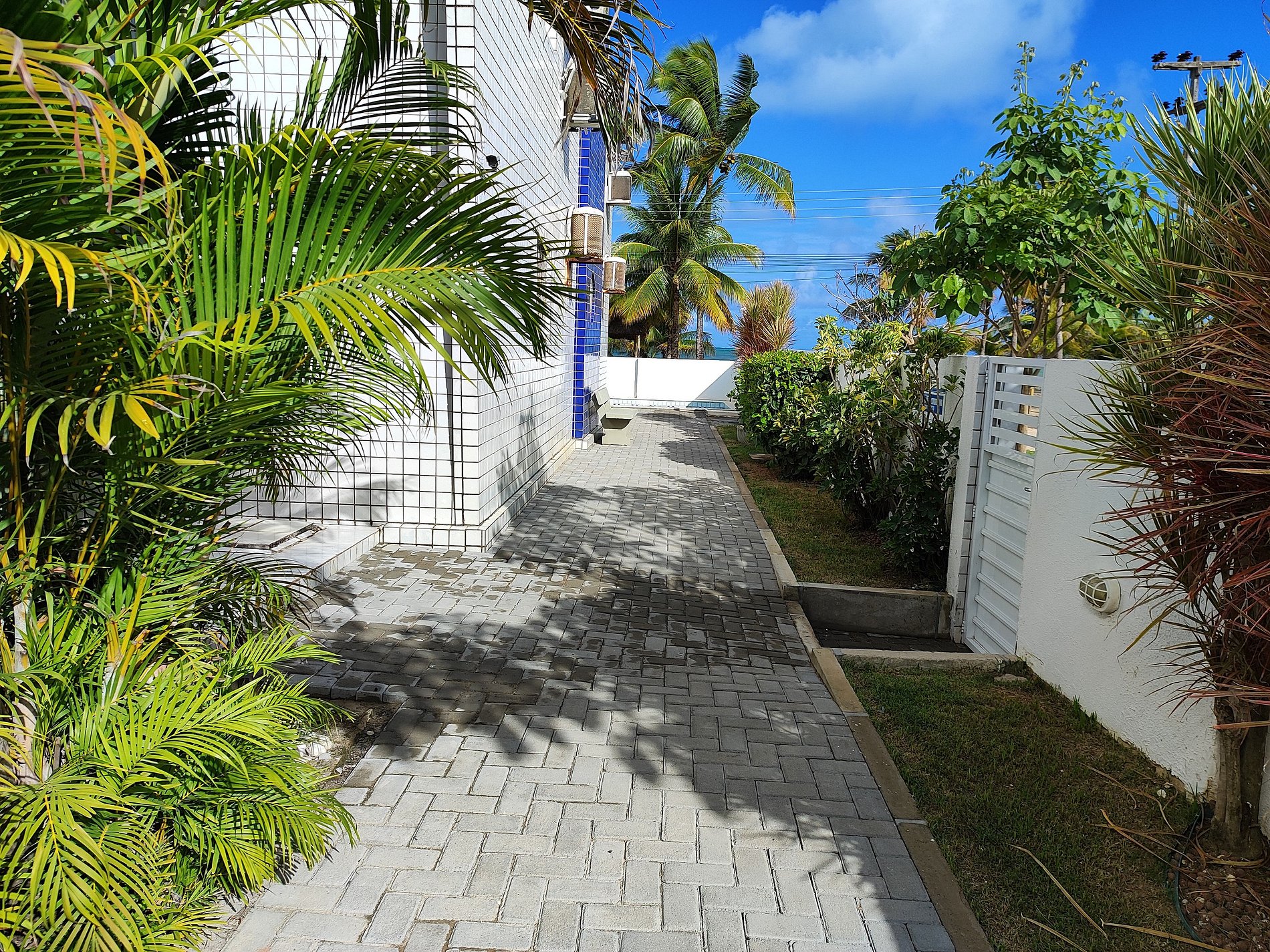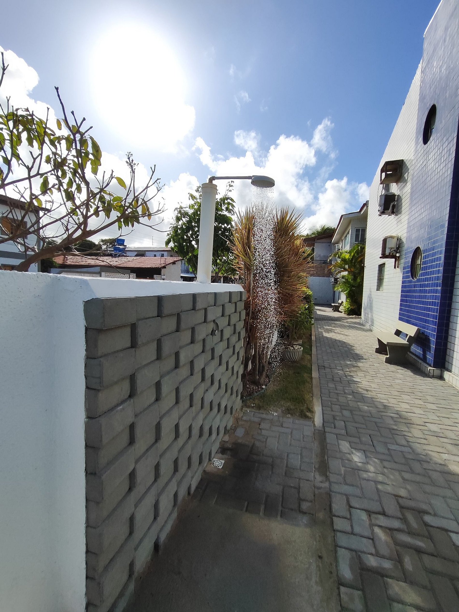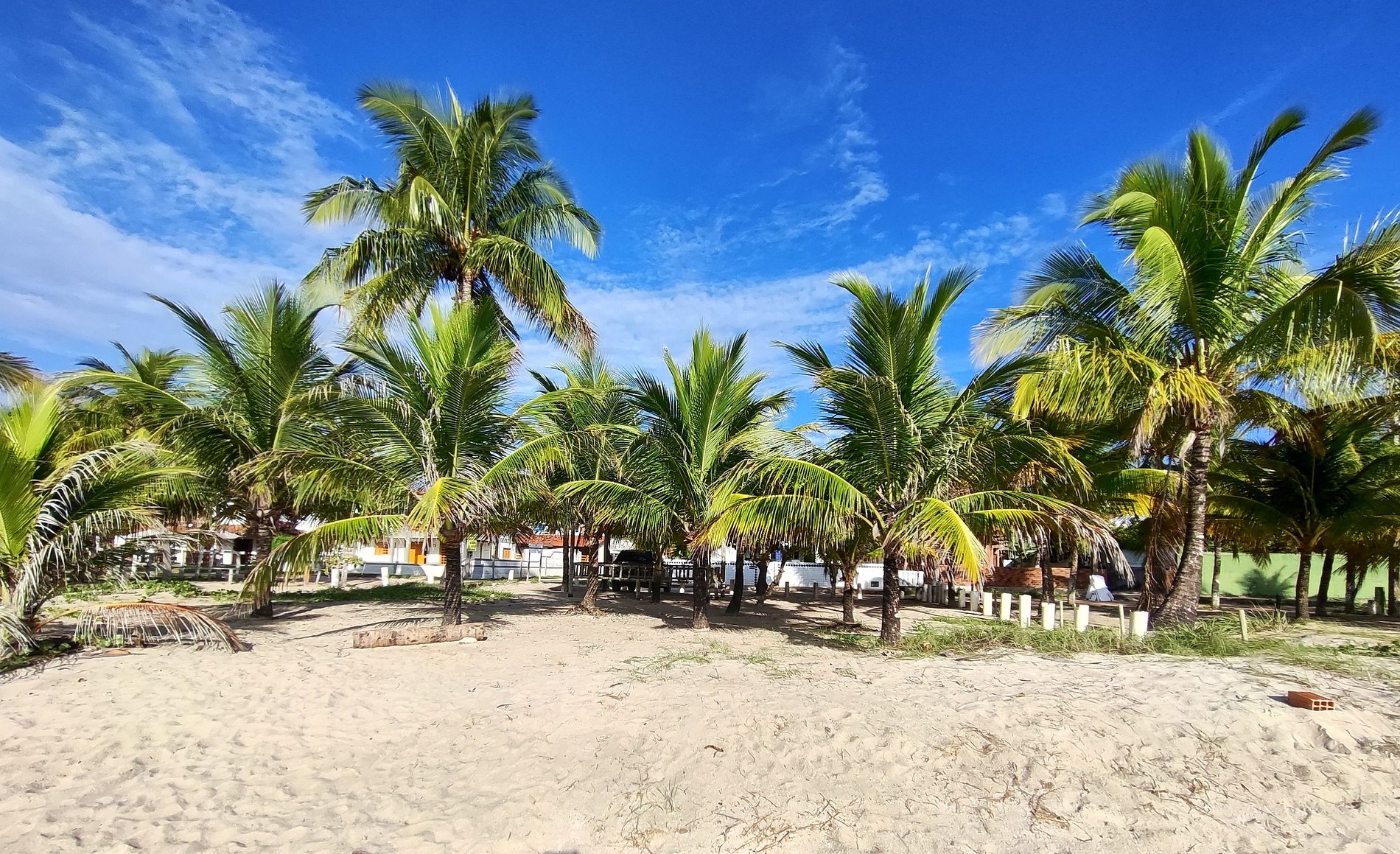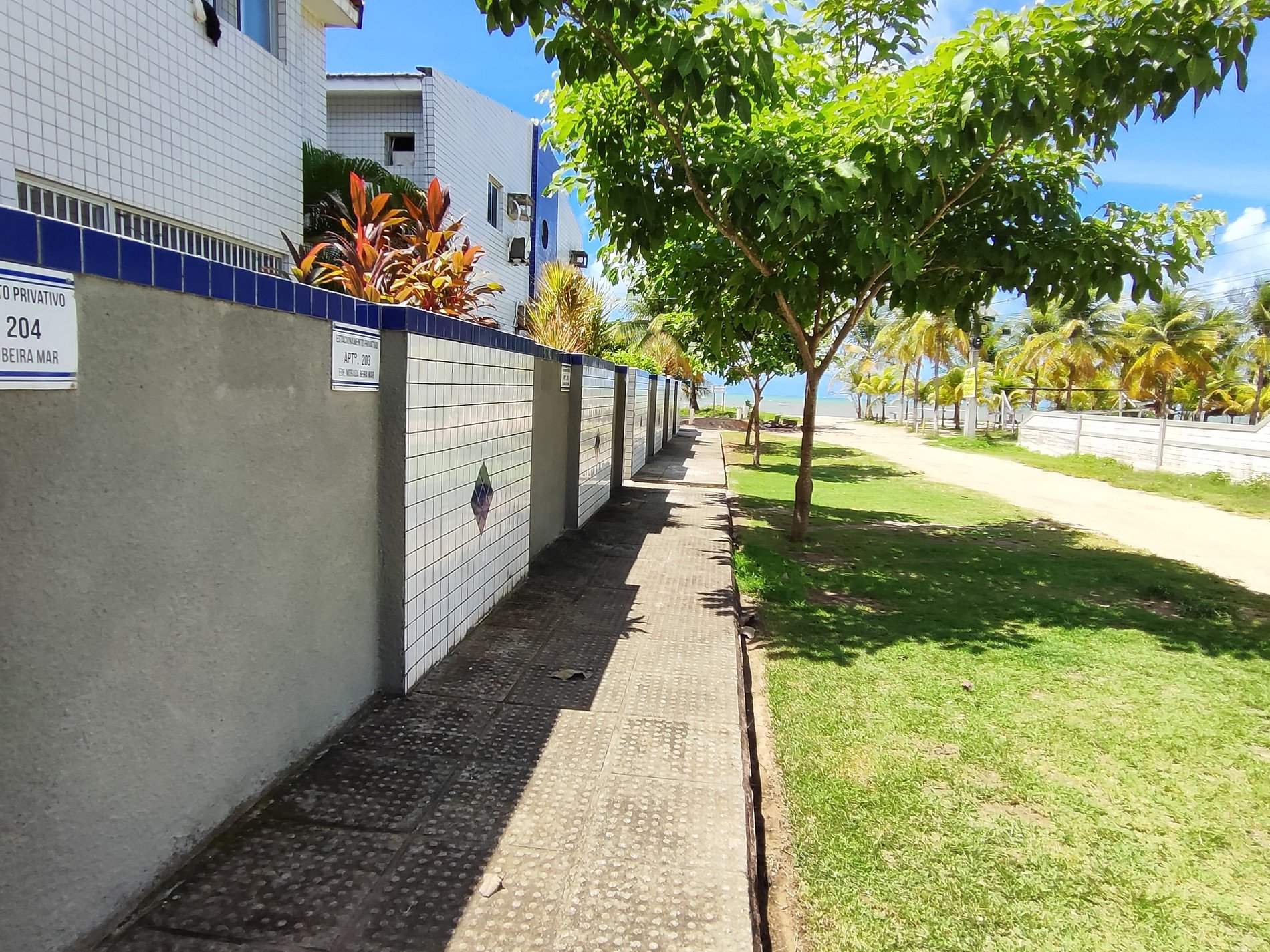 Na lateral do prédio as vagas de estacionamento estão demarcadas por placas, mas é permitido estacionar em qualquer espaço ao redor e nos coqueirais, desde que não atrapalhe a fluência do trânsito.