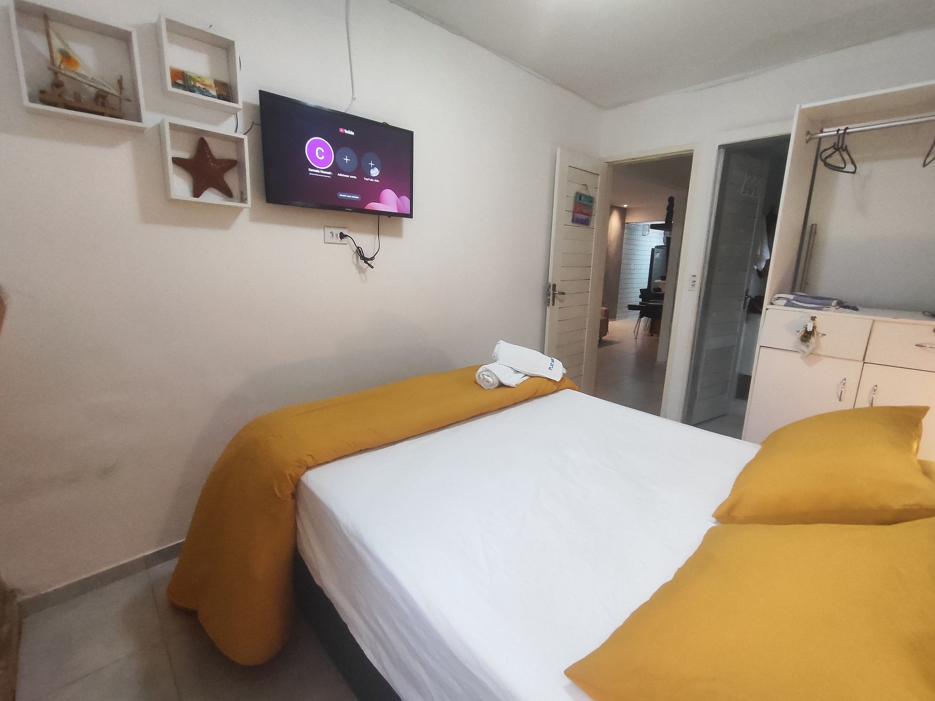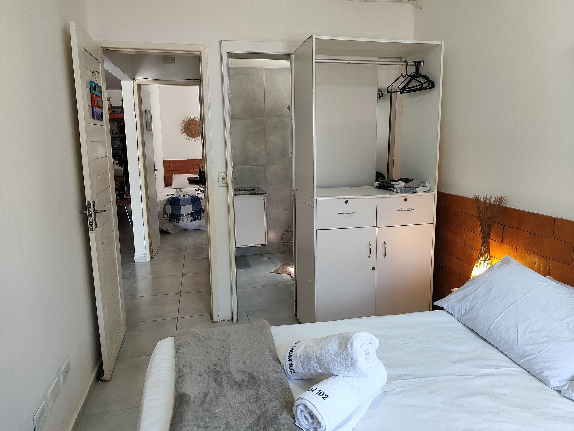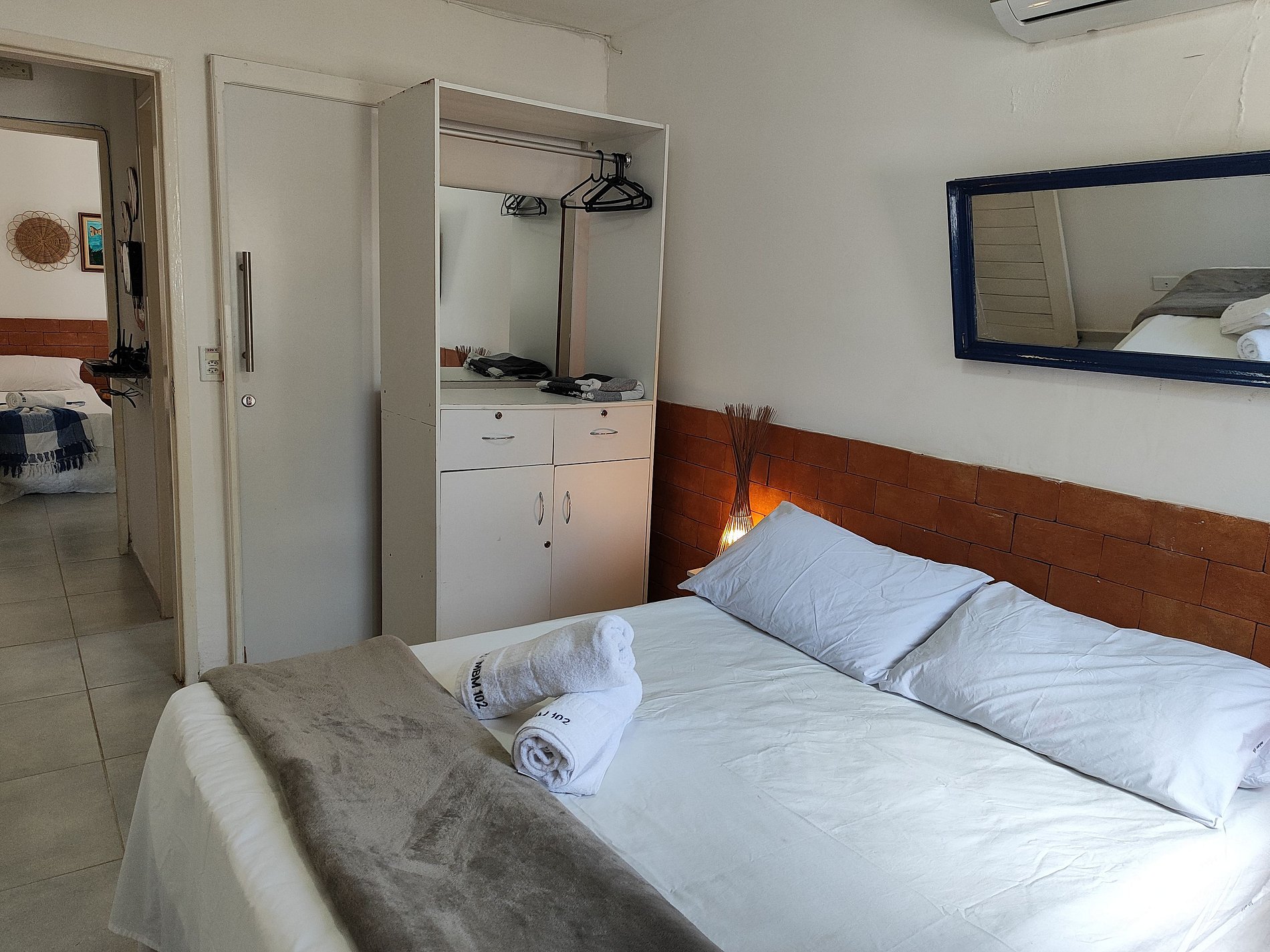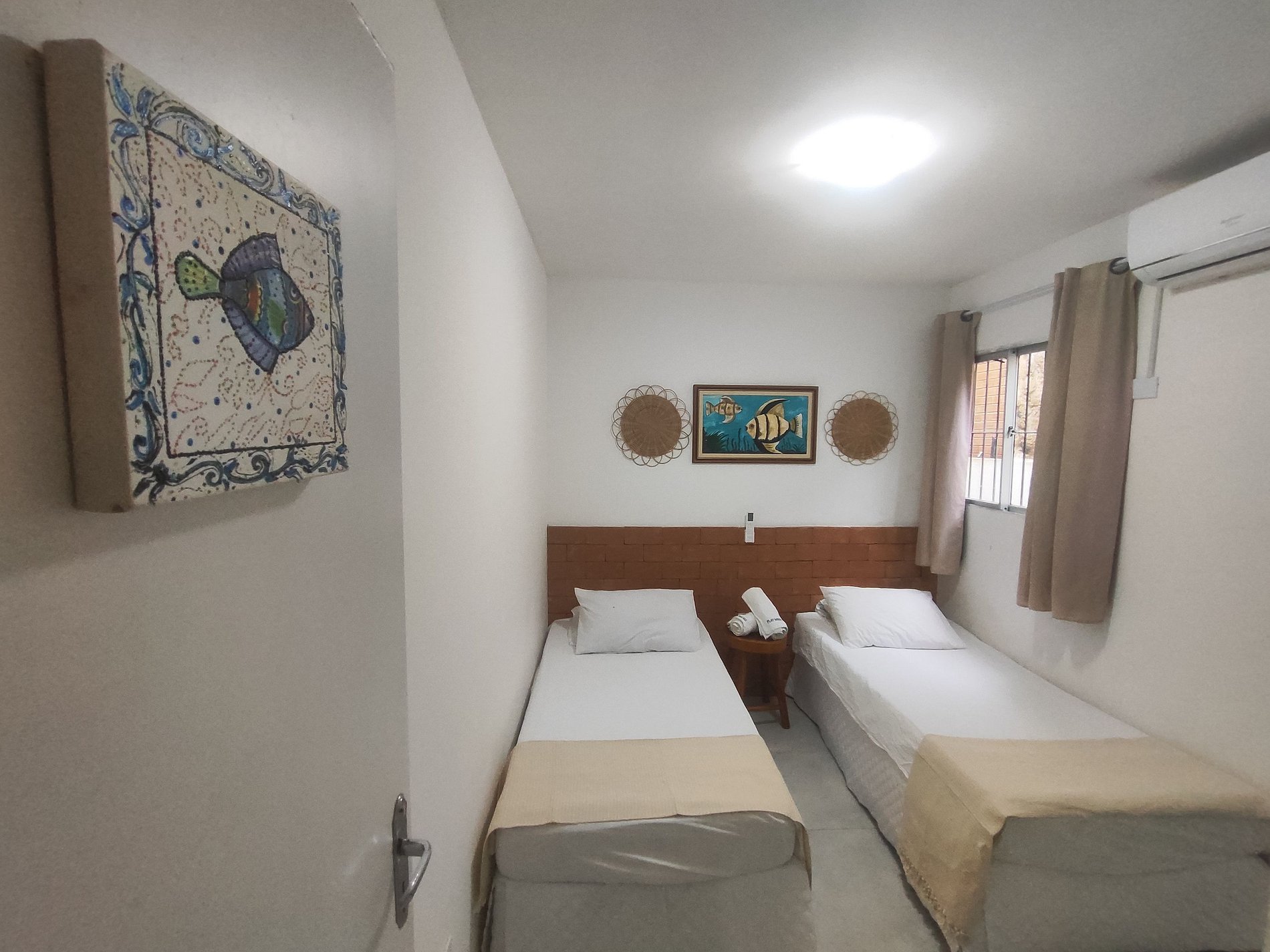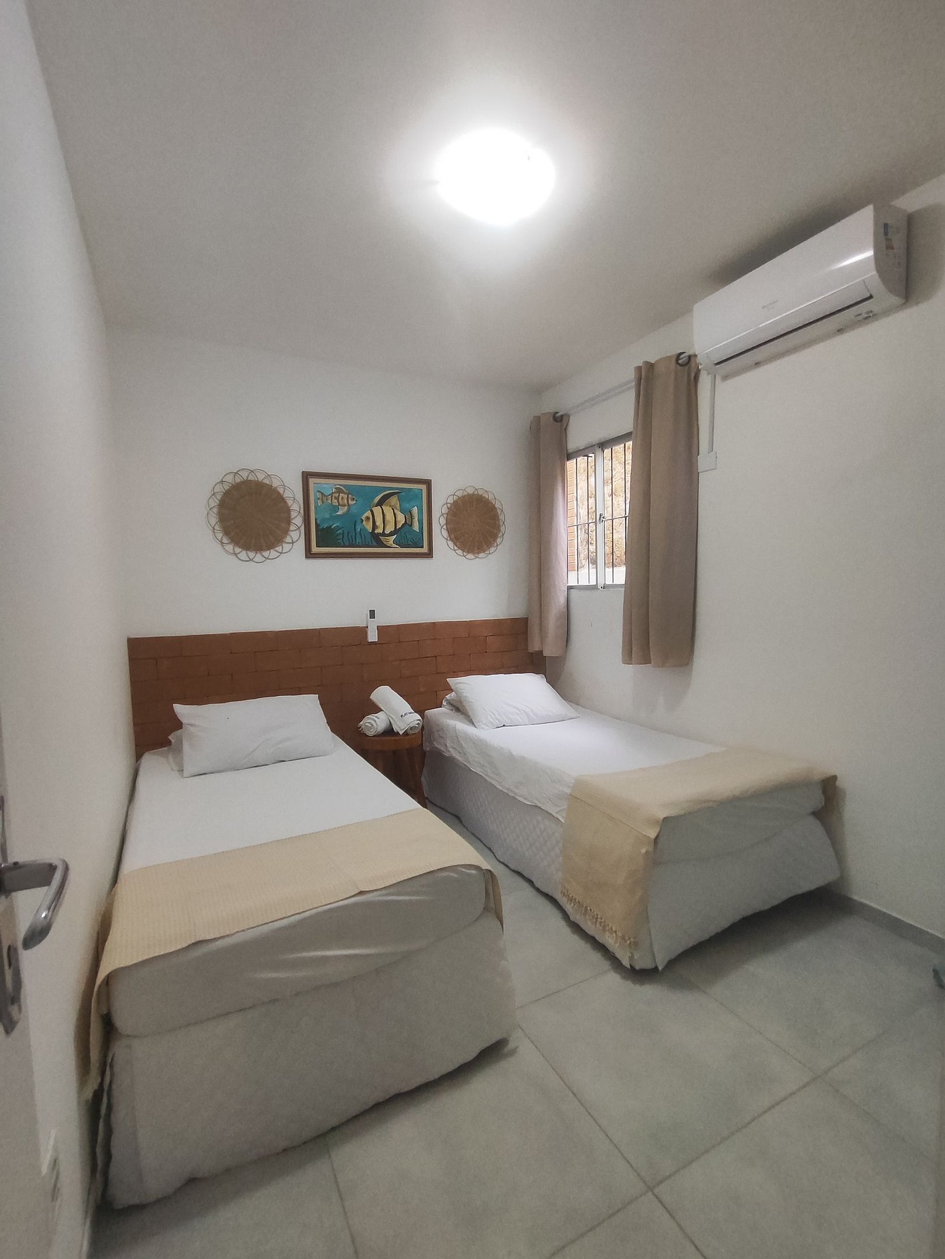 Nossos quartos: o 1º quarto tem uma vista maravilhosa para o mar em frente, é uma suíte reversível com tv e ar-condicionado split, com uma cama de casal e uma cama de solteiro de apoio; o 2º quarto tem duas camas de solteiro, ar-condicionado split, arara para roupas com cabides.