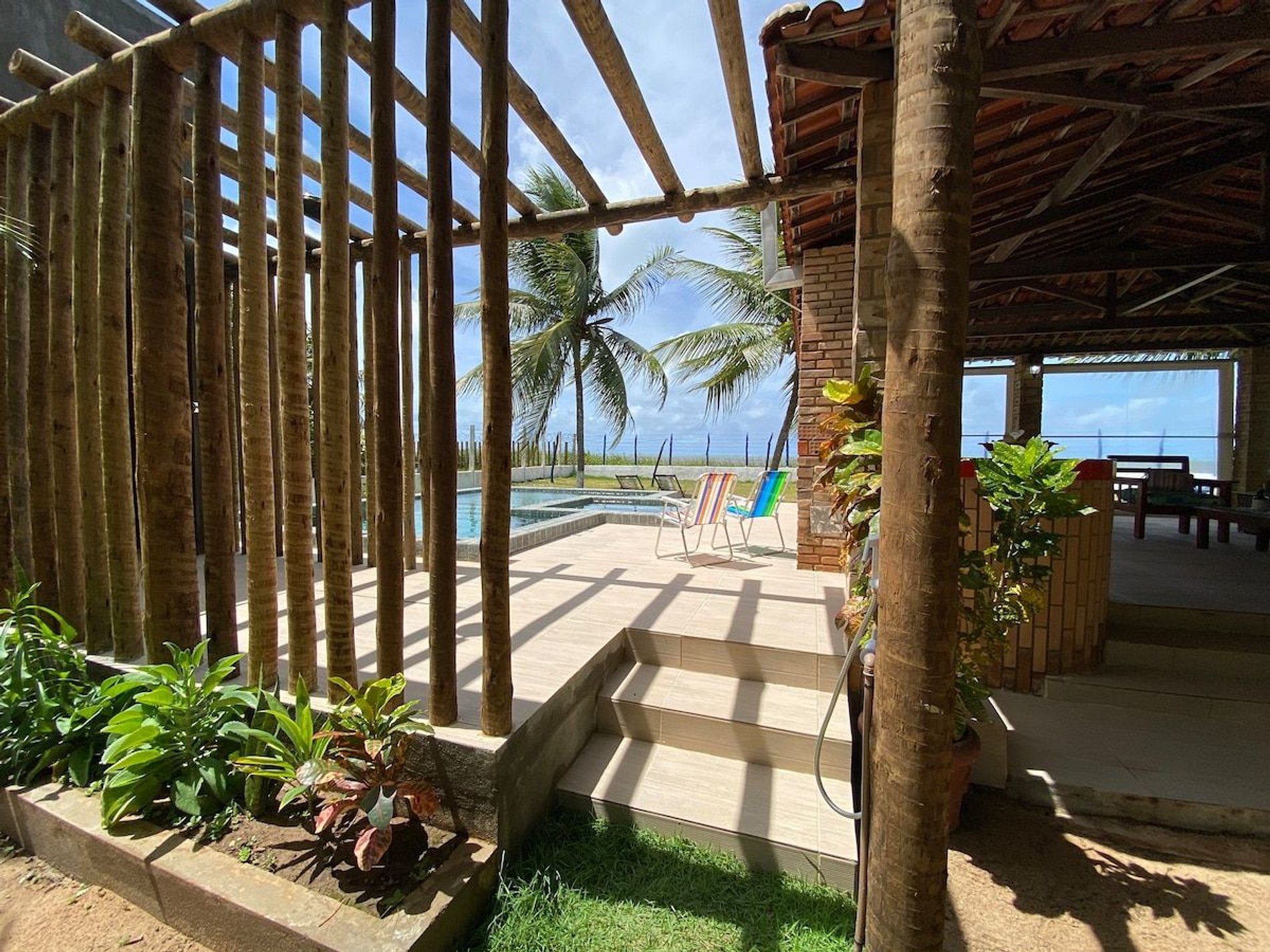 A Morada da Praia ainda possui lavanderia comum, churrasqueiras, chuveirões externos, poço artesiano, uma simpática pracinha com enormes bancos de jaqueira, um jardim com coqueirais, gramados e areia de praia, além de uma decoração praiana de saltar aos nossos olhos!